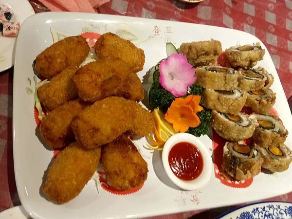 布袋雞干貝捲,旁邊的是白菜捲干貝,鮮甜!而且搭上醬汁,更添風味