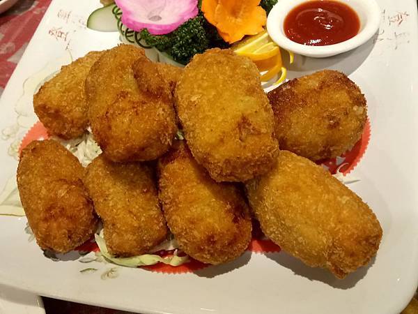 還有這個金銀香腸也很特別,說是用瘦肉包肥肉然後裹粉炸的,吃起來很有層次感