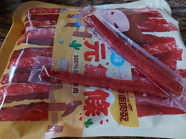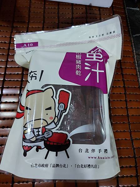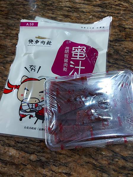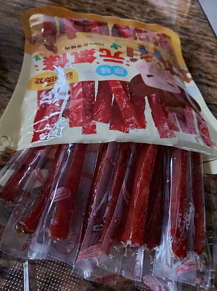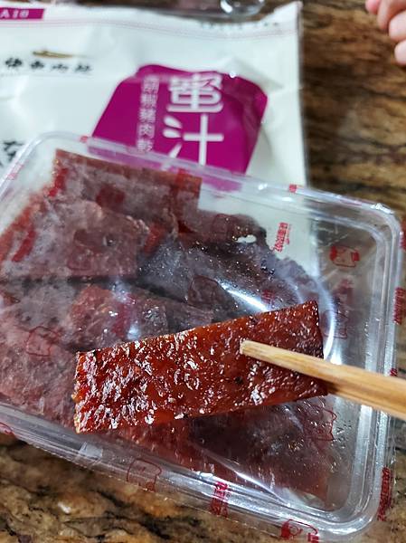 這是蜜汁黑胡椒豬肉乾,吃起來有肉干的厚度,有嚼感,不會太硬