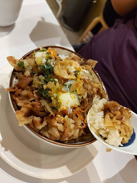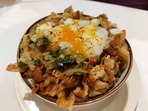 鹽蔥雪花牛丼飯,鹹甜的醬汁再搭配半熟的蛋
